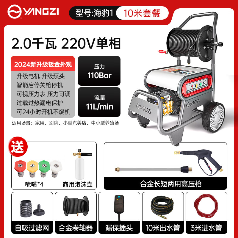 揚子海豹洗車機洗車高壓水槍高壓清洗機大功率工業(yè)洗車水槍220v洗車店養(yǎng)殖場洗車泵,商用級銅制感應電機澎湃動力三重防護,2000W-5500W商用風冷感應電機,智能調壓閥輕松掌握精準水壓。