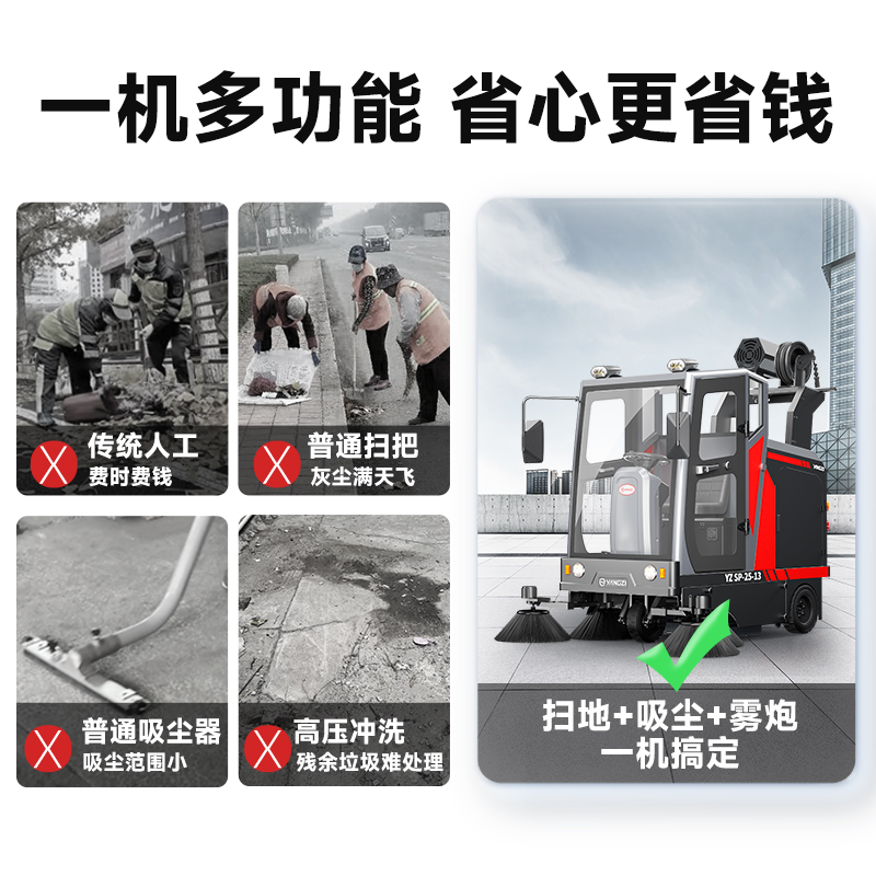 室外駕駛式掃地車掃地/吸塵/排噴,每小時(shí)清掃21000㎡,清掃寬度2100mm,續(xù)航時(shí)間4-5h,后排噴前噴霧雙功能,不用擔(dān)心滿天的灰塵。